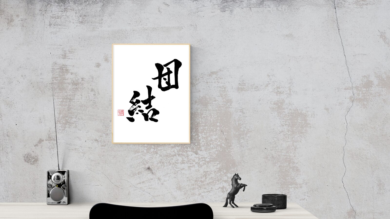 The contrast between the rounded strength of “団” (dan) and the flowing brushstrokes of “結” (ketsu) is as if to express the union of diverse personalities into one.